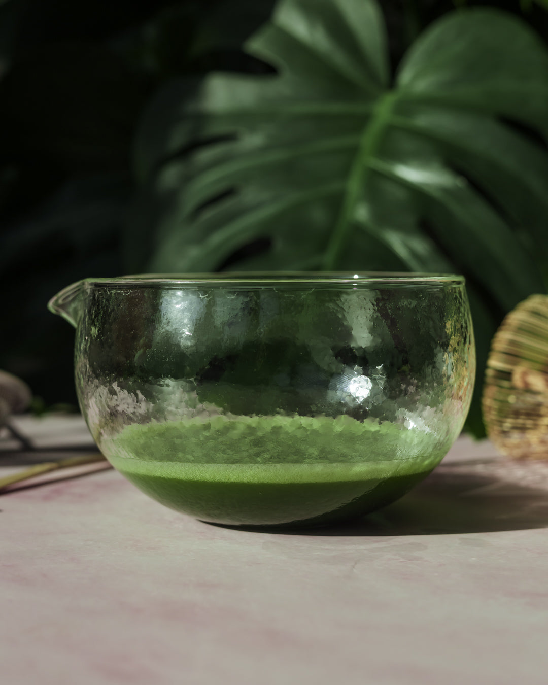 Нашият чаван е изработен от боросиликатно стъкло – чист, елегантен и съвременен прочит на вековната традиция. Прозрачността му разкрива изумрудения цвят на напитката, а гладката повърхност позволява лесно и равномерно разбиване. Текстурираната структура придава фин завършек и елегантност на всеки ритуал. Практичният улей улеснява преливането в чаша, без риск от разливане, а можете да се насладите на напитката и директно от купичката – както е в традицията.